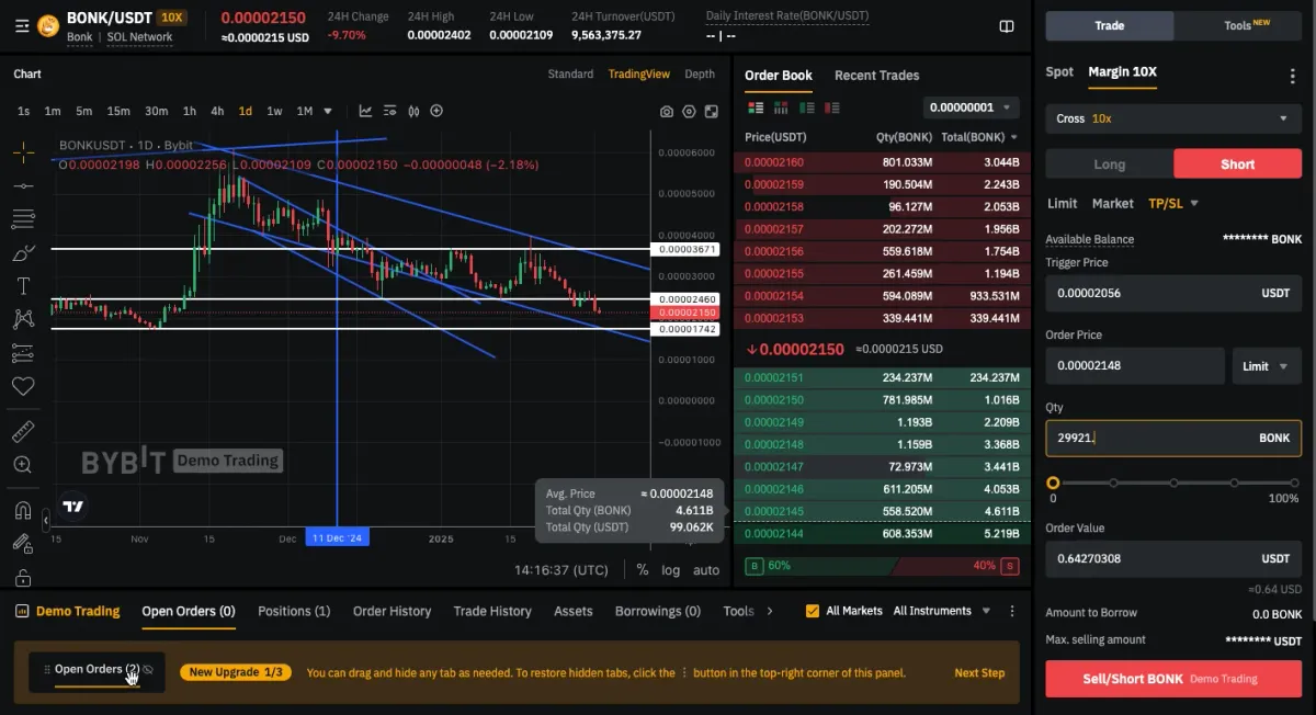 현재 봉크는 추세선 안에 있으나 지지선을 이탈하여 추세선 채널 안에서 더 하방할 가능성이 있습니다.