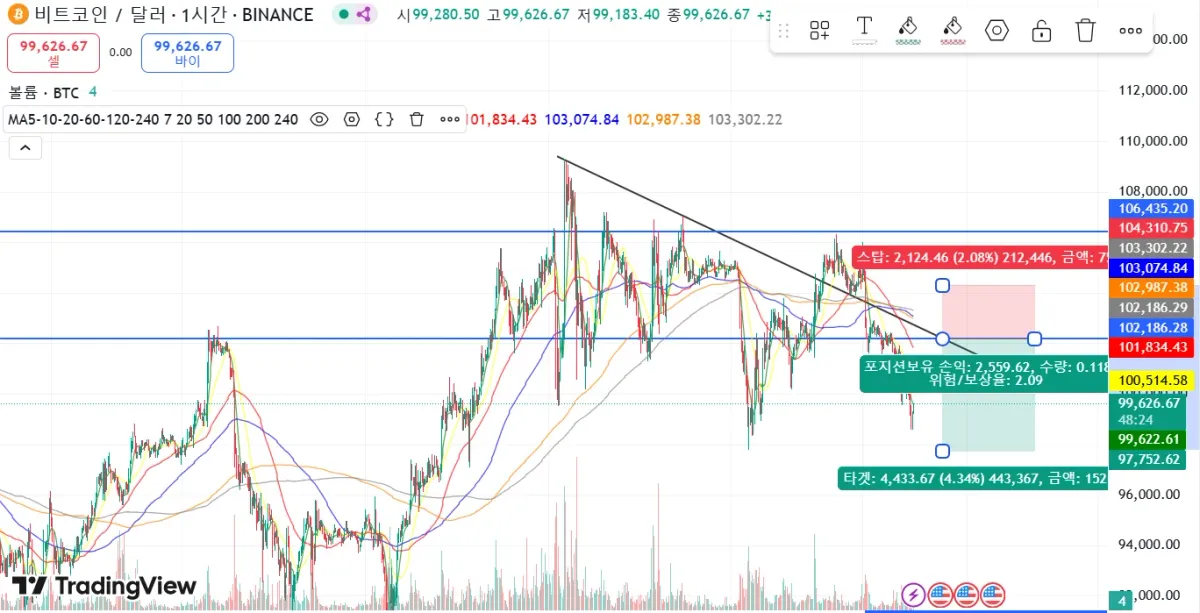 하기 이미지와 같이 추세선 돌파하려다 저항맞고 장대음봉으로 추세선 내 진입, 단기적으로 조정으로 보고 102,100 에 숏 진입 손익비 1:2 TP/SL 설정했으나