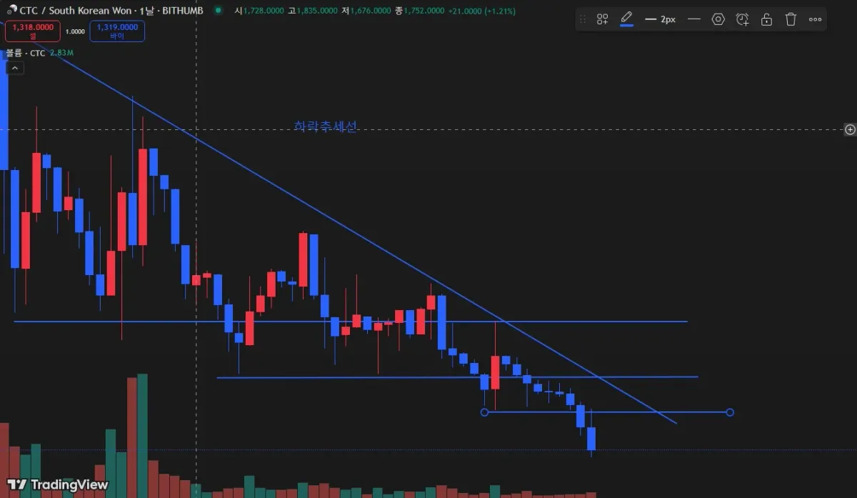 현재 물려있는 빗썸거래소 크래딧코인 하락추세선과 지지 저항선을 작도해봤습니다 쭉쭉 하락중입니다 ㅠ.ㅠ