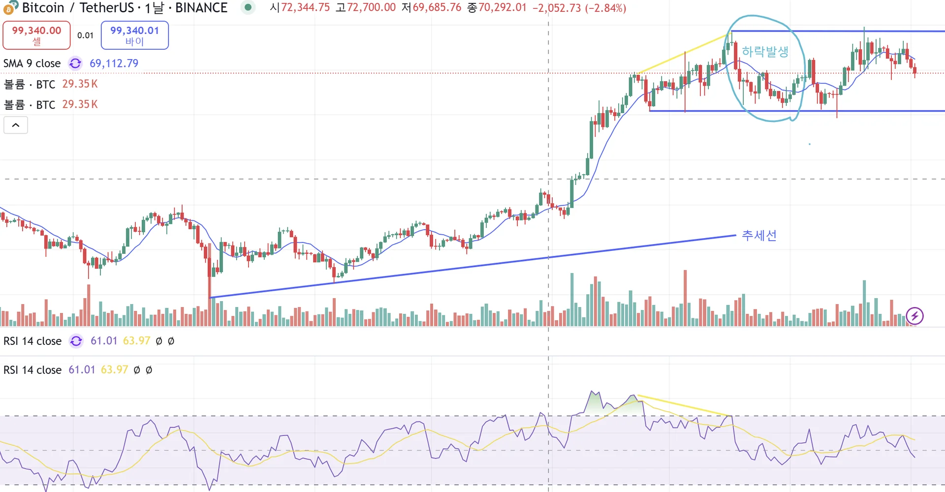 RSI의 고점이 낮아진 후에 하락이 일어났습니다