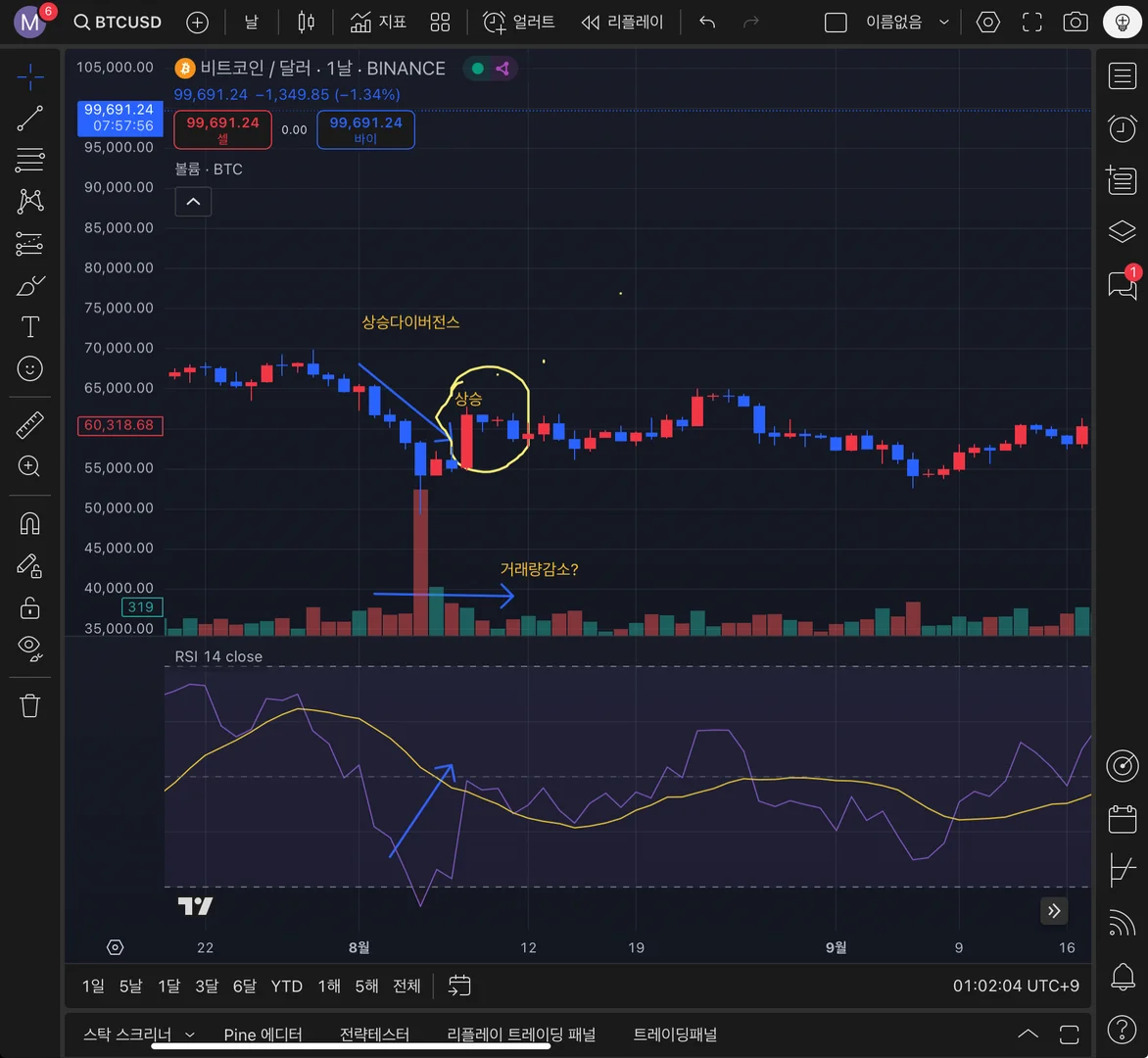 가격은 상승, rsi는 하락 = 하락 다이버전스.