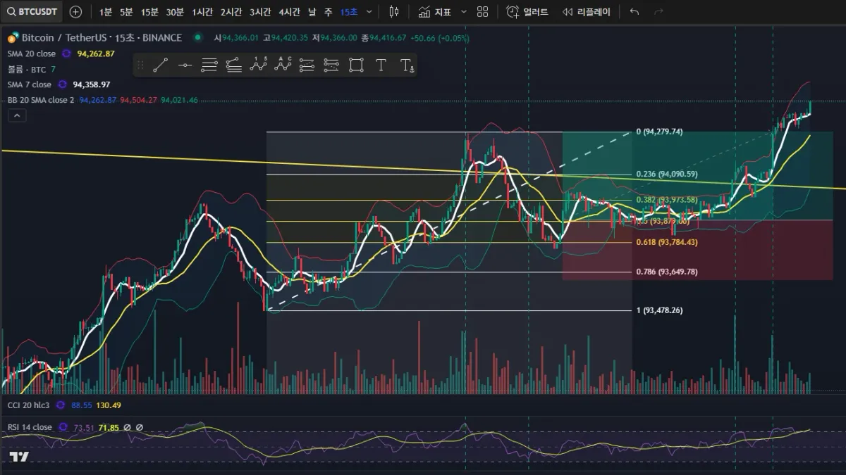 - 93k 저점에서 상승추세 피보나치 되돌림 확인, 0.618 찍고 상승흐름 확인