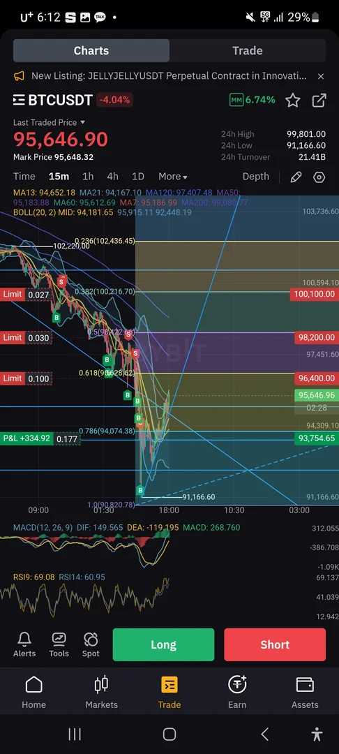 일하는 중 핸드폰을 확인했을 때 빅숏에 롱진입 추가진입 전부 터졋다. 여기까진 해볼만한 구간이라 생각하고 받은거라 관점이 틀렸을 뿐 틀리지 않았다 생각한다 . 반등을 예측한 것이 잘못이라면 잘못 어설프게 중기저항 심리적 기술적 저항선 이런 생각을 하며 거래에 확신을 갖고 손절점을 늘리고 지지구간을 한번 더 사용하며 추가진입을하였으나 결국 손절엔딩 이후 레버리지 15배에서 20배로 증가, 풀시드를 같은 구간에서 분할진입(실제로는 한번에 들어간 수준) 제대로 된 것이 하나도 없는 잘못된 투자라고 자평한다