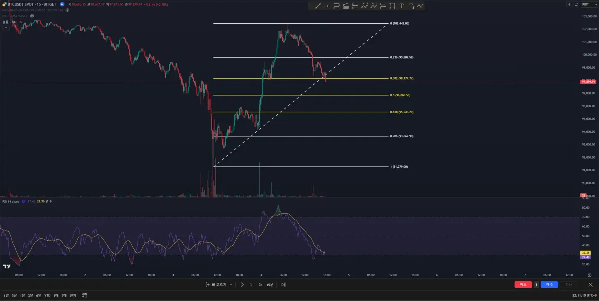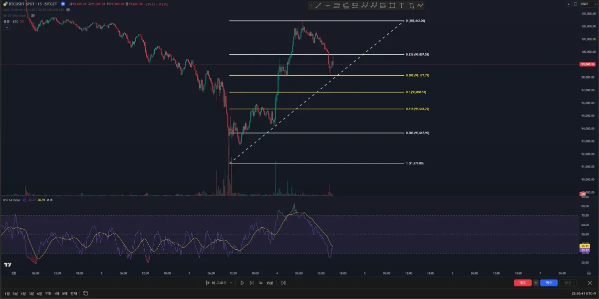 BTC 하락 중에 피보나치 되돌림구간에서 0.382 터치 후 상승.