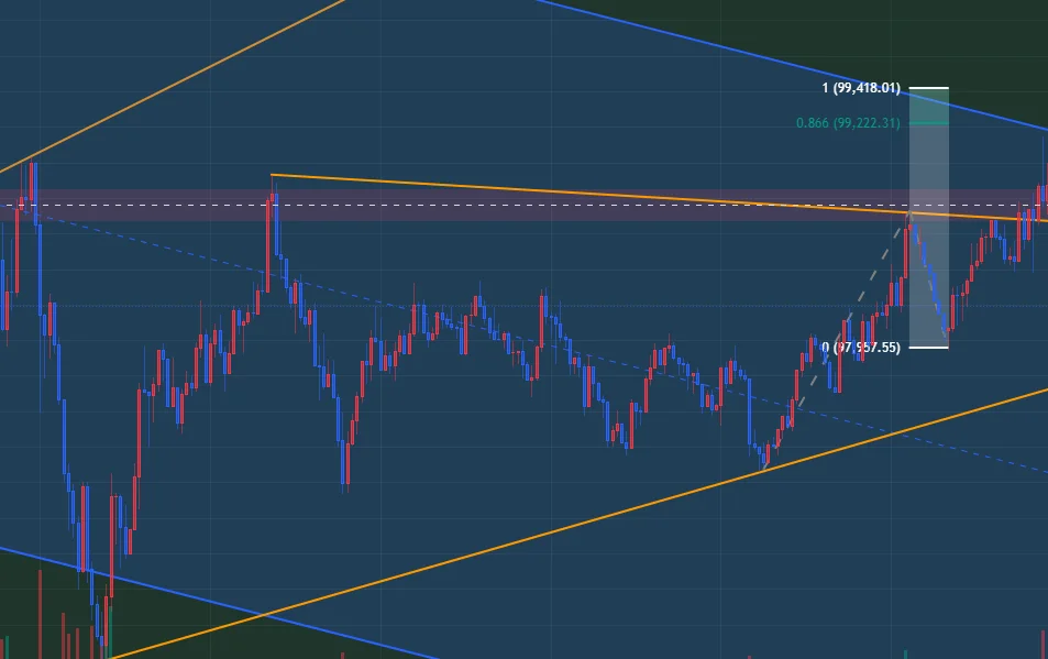 97900에서 반익 완료. 현재 하단 추세선에서 다시 지지되는 모습을 보이는데, 시간도 늦었고 해서 SL만 평단가로 맞추고 목표까지 노려보려고 합니다.