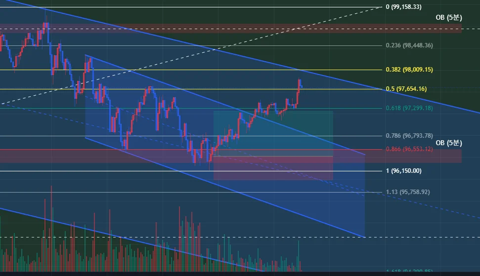 OB 5분, 거래량 큼, 피보나치 1부근까지 되돌아와서 분할 매수로 롱포지션 진입