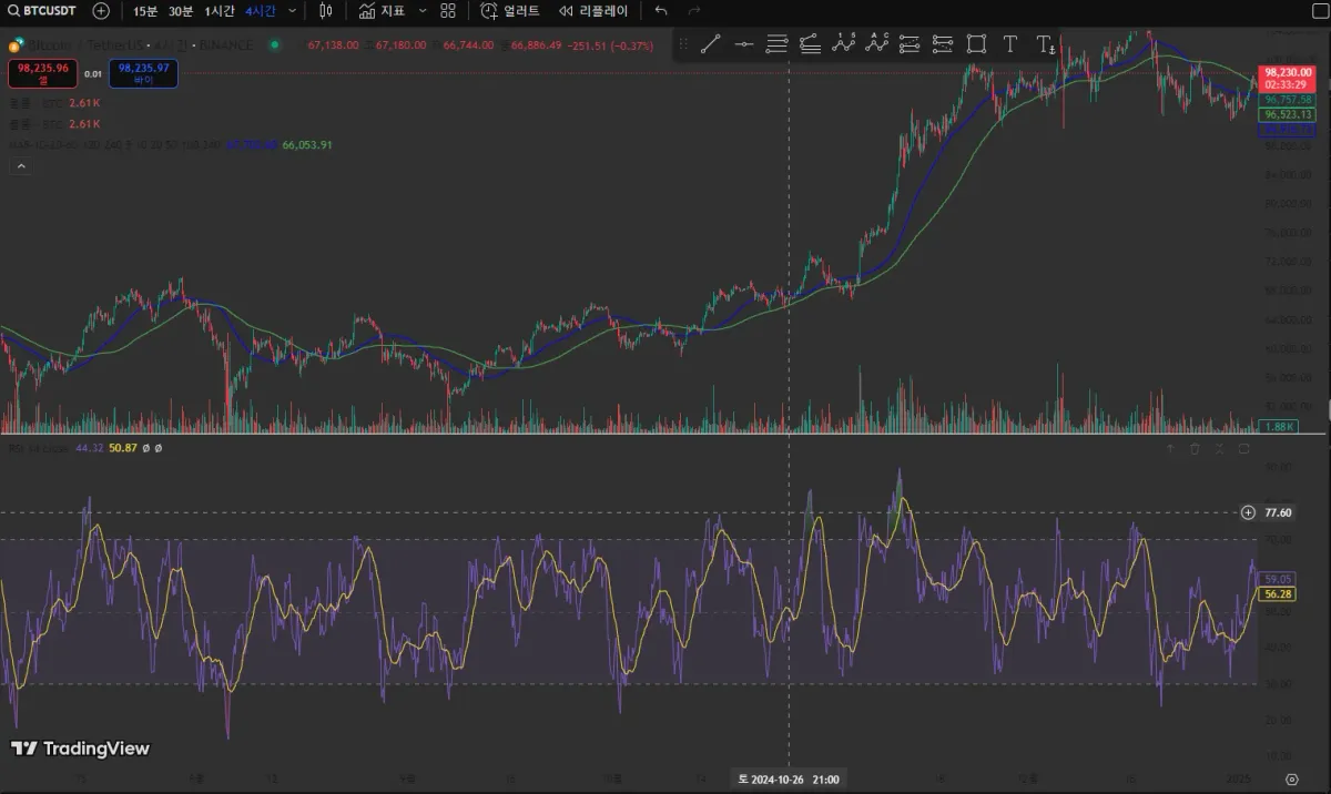 과매수 구간에 있던 RSI가 70을 하향 돌파 시에는 매도, 과매도 구간에 있던 RSI가 30을 상향 돌파 시에는 매수