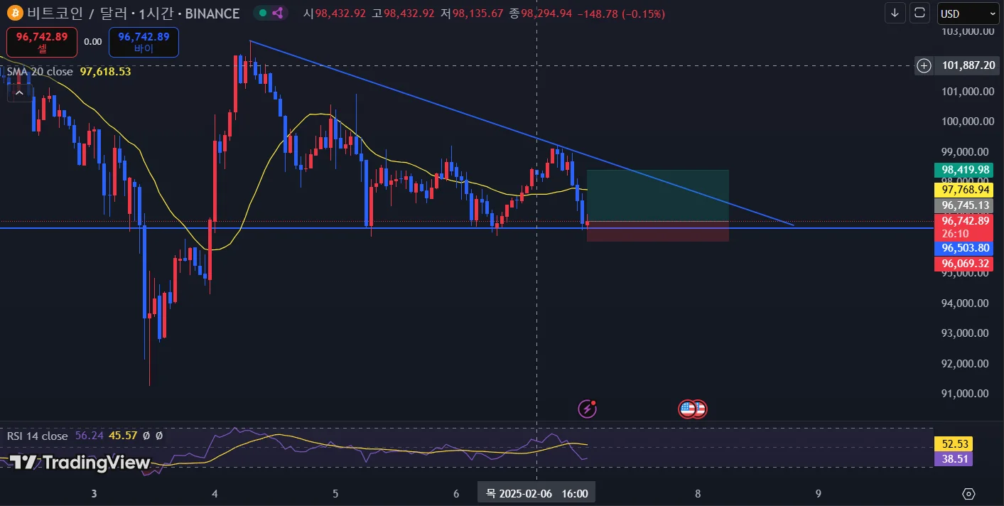 1시간 봉으로 봤을 때 아래 평행선 부분에 지지를 받고 고점은 낮아지고 있기 때문에 손실을 짧게 잡고 레버리지로 짧게 롱포지션에 진입한다면 위에 저항선까지 수익을 볼수있다고 생각이 들었습니다!