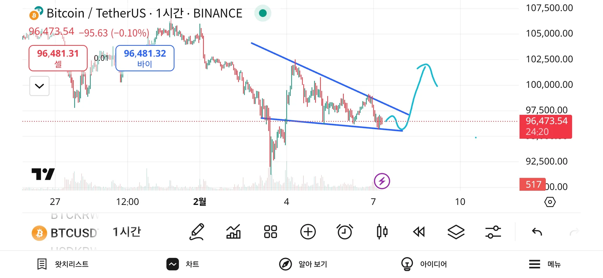 1시간봉으로는 관세빔 하락 이후에 반등후 삼각수렴(?) 패턴처럼 보입니다.