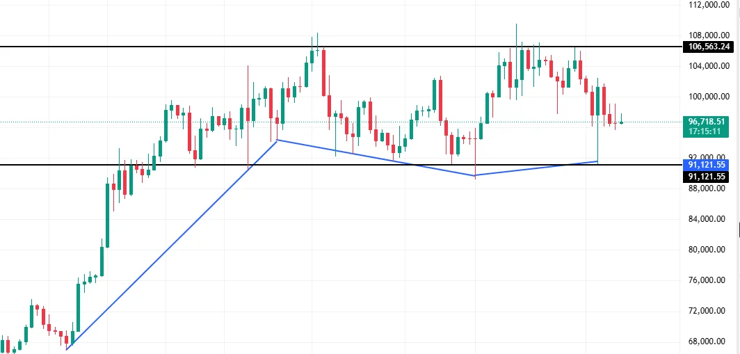 BTCUSDT 1일봉 을 봤을때 지지선이라 생각되는 부분에 가로줄을 썼고