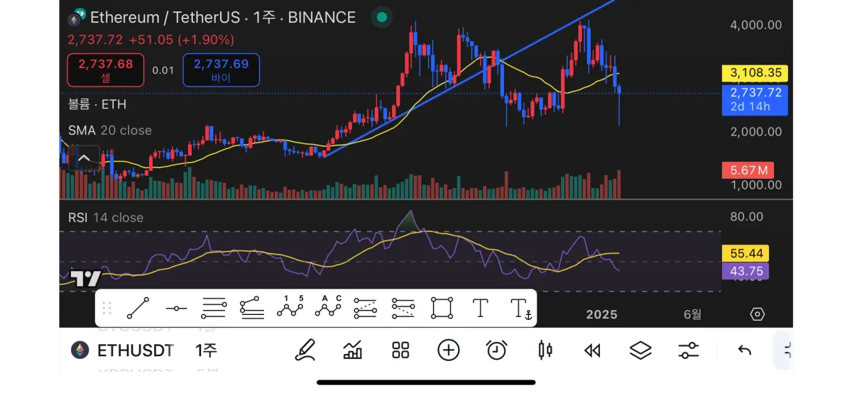 상승추세선을 유지하다가 7월1일에 추세이탈하고 다시 추세산 위로 올라가려했지만 실패한것으로 보인다