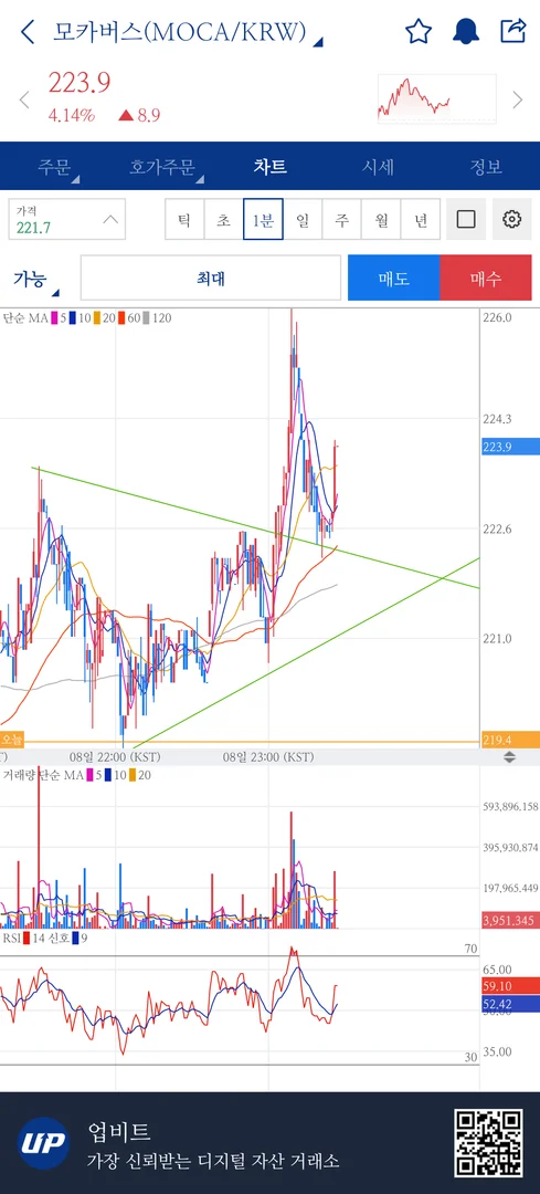 21시20분경에 갑작스런 상승(사진2에 좌측참고)으로 저항선이 깨졌다는 판단하에 224에 진입했습니다. 그러나 판단과는 다르게 하락추세를 보여 손절을 할 생각이 들었습니다.