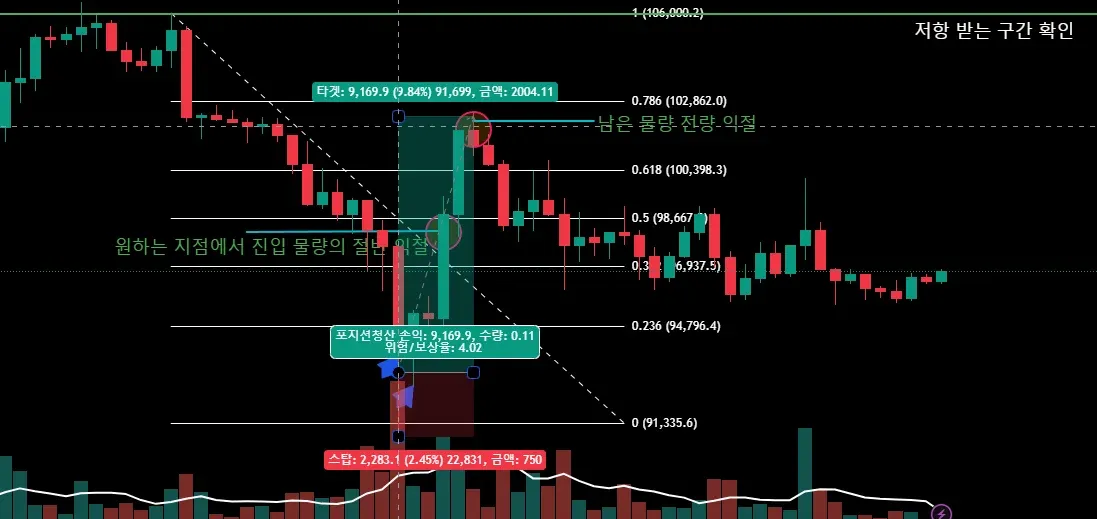 4. 저점과 0.236 선의 중간 지점에서 1차 매수하고 반등이 멈추고 다시 하락이 시작되는지 추세를 지켜봄.