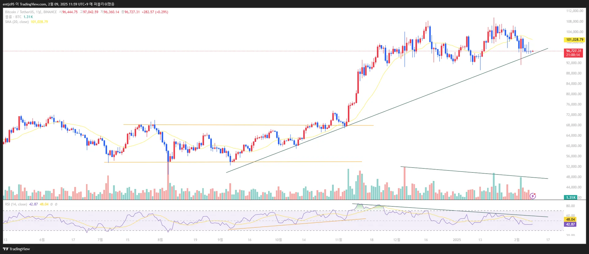 작년 11월말 가격 상승기 이전에는 가격이 저점을 높이면서 RSI도 같이 상승해 저항선을 돌파 후 강한 상승을 이어간 모습이 뚜렷하고 현 시점에서는 가격은 상승후 보합을 보이고 있지만 거래량과 RSI가 모두 하락하고 있어 이후 하락추세 반전이 가능성이 높아보입니다.