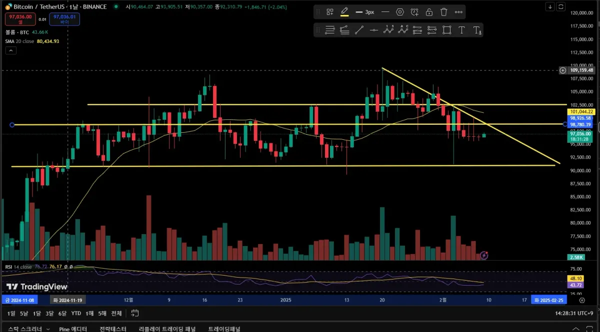 하락추세선입니다. 3차지지선까지 하락할것으로 보입니다.