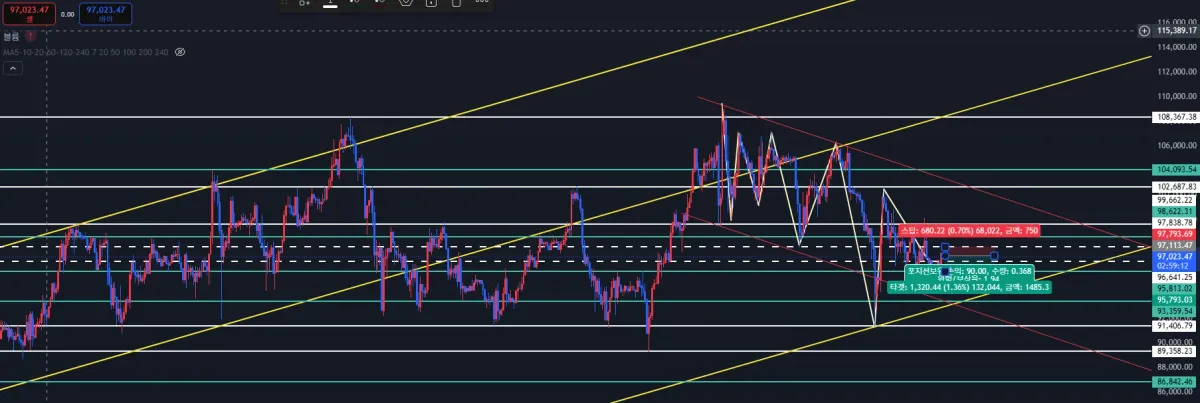 고점이 계속 낮아지고 저점도 크게 낮아졌다가 반등한 것으로 보였습니다. 잠시 반등이 나와주었지만 재하락할 것으로 판단하여 숏으로 진입해 보았습니다. 영어로 되어 있고 또 처음이라 손절가와 익절가를 어떻게 해야할지도 몰라서 1% 수익이 나왔을때 익절했습니다.