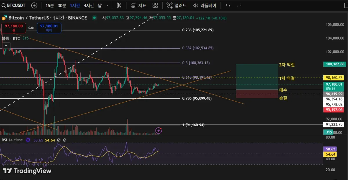 여러번 지지, 저항을 보인 흰색 실선 (96450)과 저점을 이은 주황색 추세선이 겹치는 부분에서 매수 들어가고,