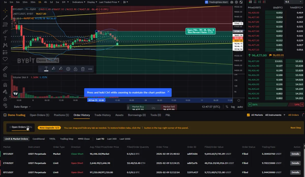 $97,840 인근 저항선을 돌파하기 어려울 것으로 판단 -> 저항선까지 도달 전에 하락할 수 있으므로 그보다 밑 지점에서 포지션 결정