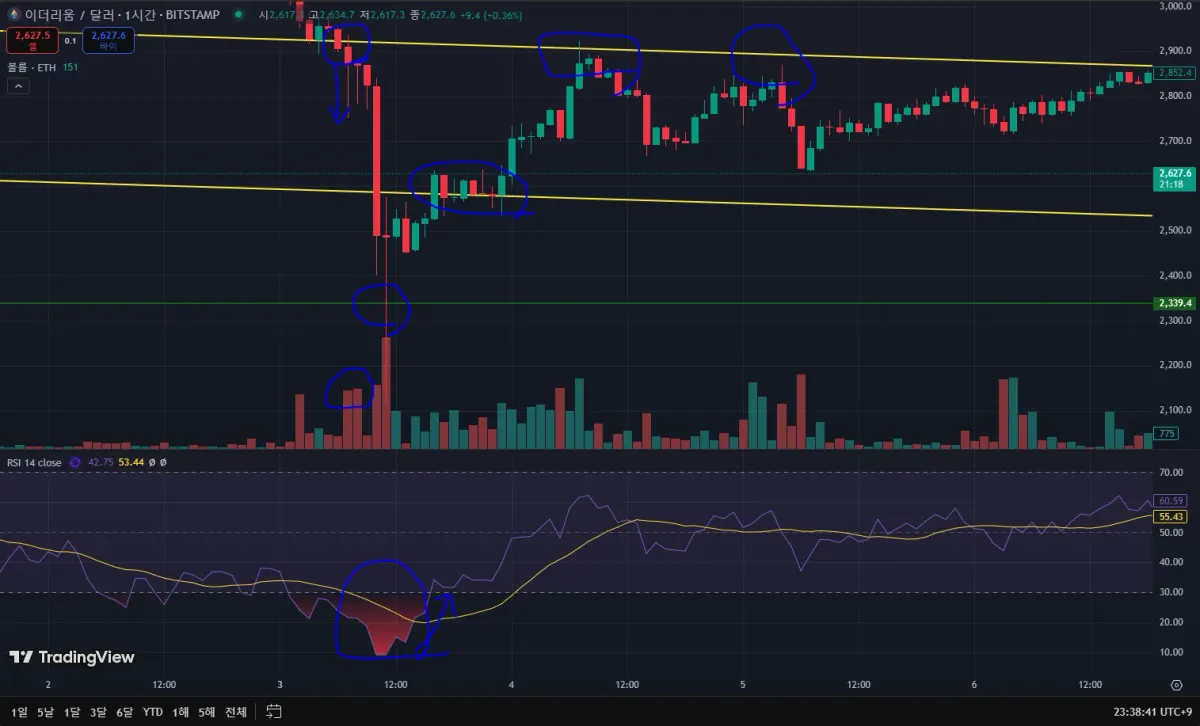 지난 3일 채널을 뚫고 캔들이 내려갔지만 지지선을 바탕으로 다시 반등하는 모습을 보여줬습니다. RSI 과매도 부근에 있어 이점을 매수 포인트로 잡았고 현재 다시 채널로 복귀하여 상승 하락을 반복하고 있습니다. 채널 상단인 2700대에서 반익하고 그 위 채널까지 들고갈 생각입니다. 참고로 견고한 지지선을 보여주는 2340 부근에서는 손절할 생각을 하고 있습니다.