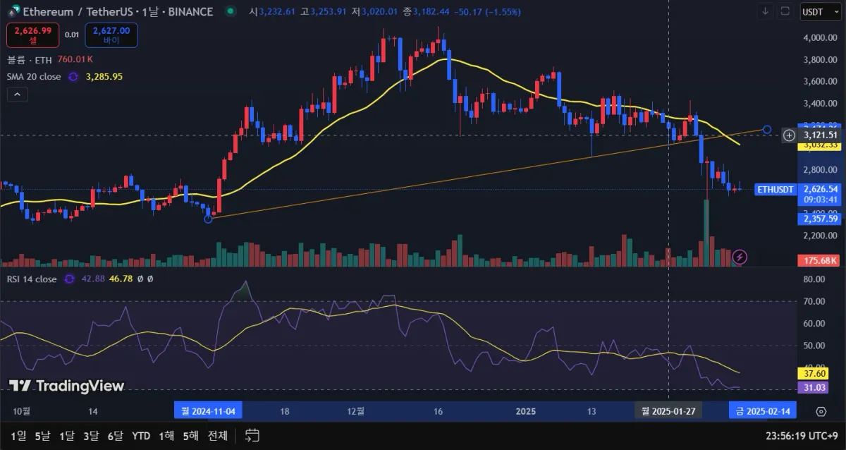 이더리움 차트입니다. 상승추세선을 이탈하여 하락하는 모습을 보이고 있습니다