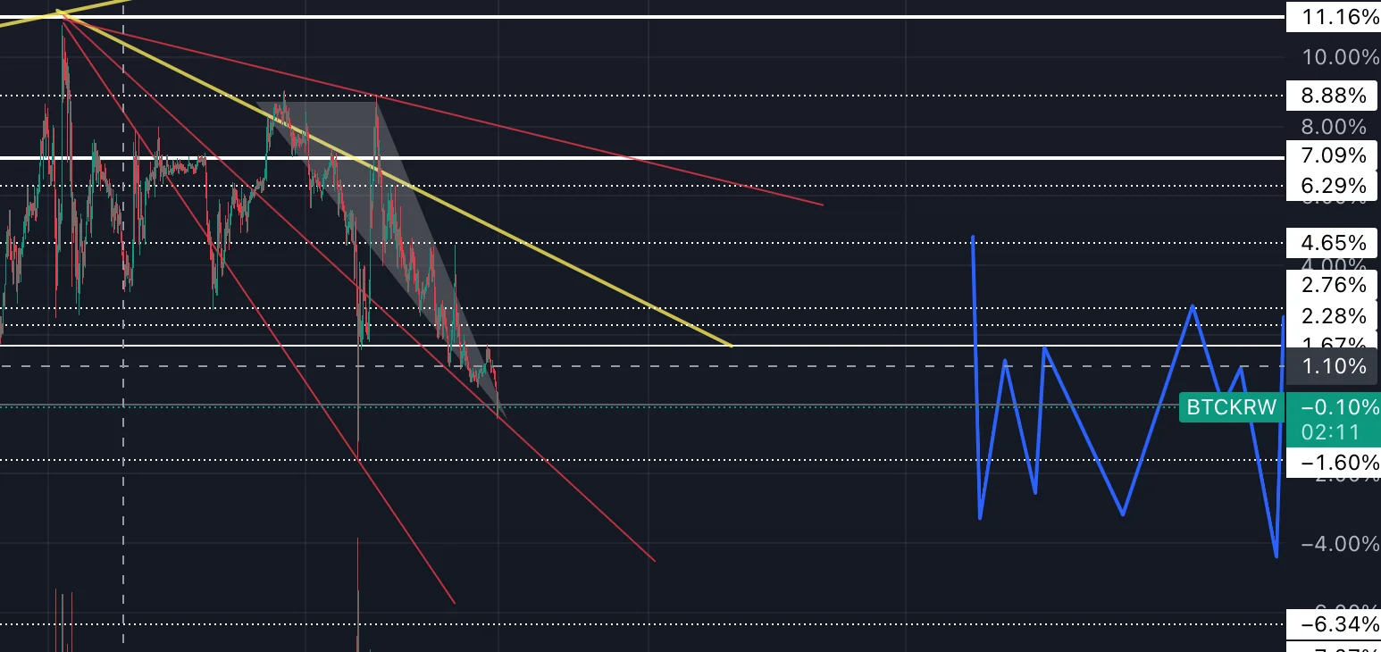 최고점에서 부터 계속 고점과 저점이 낮아지고 있는 하락추세와 폴링웻지 패턴이 보였습니다.