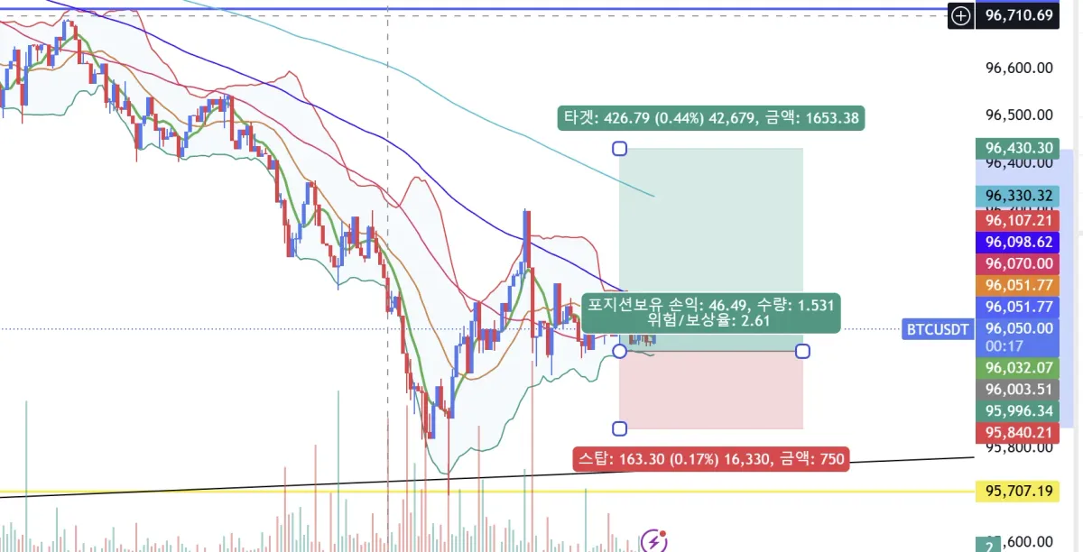 지표는 볼린저밴드 활용하여 하단부분 터치후 반등하는 움직임 보여 96003에서 롱포지션 진입했고