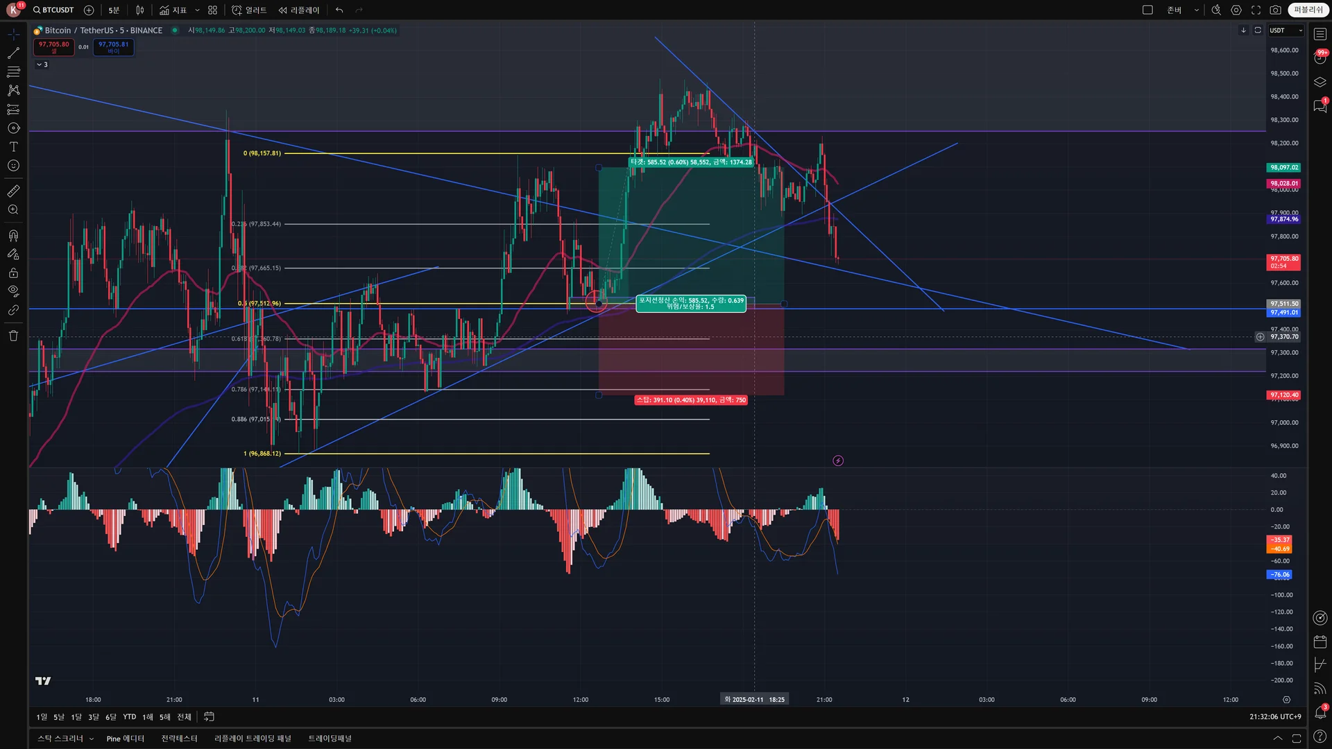 진입 근거 - 상승추세선 근처, 지지선 근처, 바로 직전 하락에서의 ob, 피보나치 0.5구간, macd 골든크로스 예상구간, 200ema 지지 받아줄 가능성