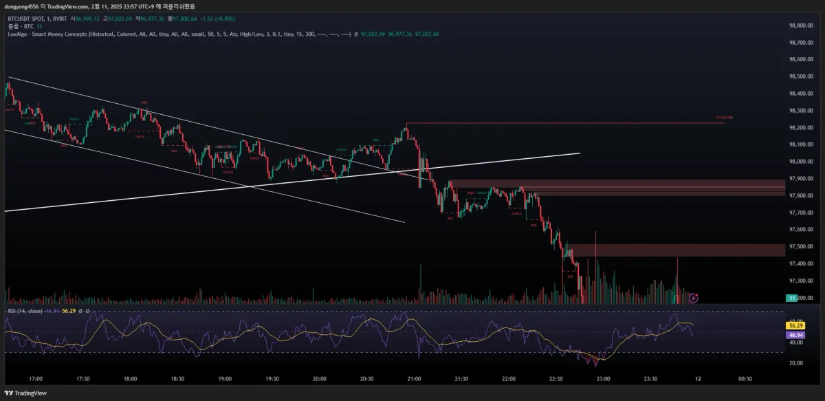 1분봉 단기 하락채널 진행중에 15분 상승 추세선 터치후 하락 채널을 이탈, 고점과 저점을 높이며 상승 추세로 전환되나 싶었지만 상승 추세선을 크게 하방 이탈하였음.