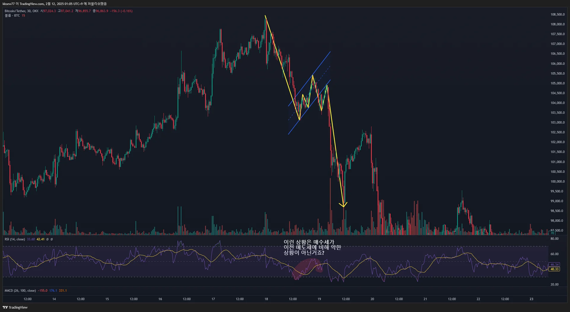 강의에 나온 예시에서는 베어 플래그 패턴 직전 하락에서는 rsi가 과매도를 가르키고 있었는데요.