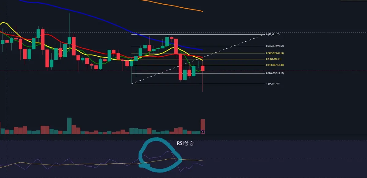 RSI지표를 보았을때 상승하고있었고 피보나치 대돌림의 근거하여 96,509로 진입하여서 익절가격= 97,830 손절가격=95,118