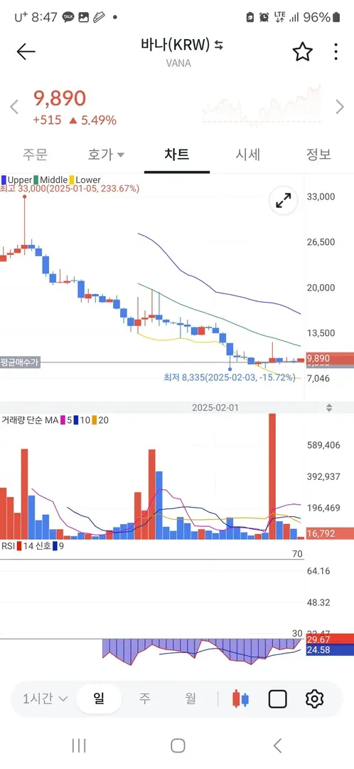차설님 단타 영상 보고 RSI 30밑에 지점과 횡보하는 동향 밑에 볼랜져 밴드 터치 했을때 매수 했습니다! 현재 5% 수익권 꼭 익절로 마무리 짓겠습니다