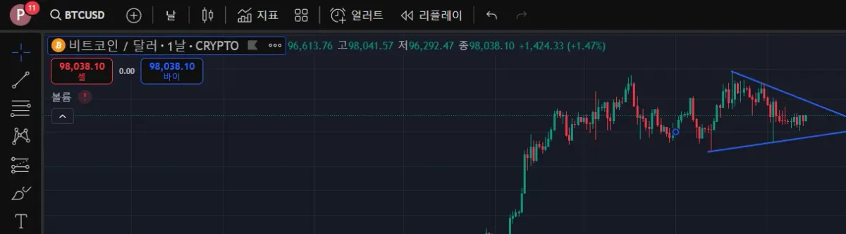 차트의 저점들을 이은 상승 추세선과 차트의 고점들을 잇는 하락추세선을 그어봤습니다. 상승하는 추세선도 있고 하락하는 추세선도 동시에 있어서 어떻게 될지는 모르겠지만 손절라인 및 돌파구간을 어느 정도 예측할 수 있는 상황인 것 같습니다.