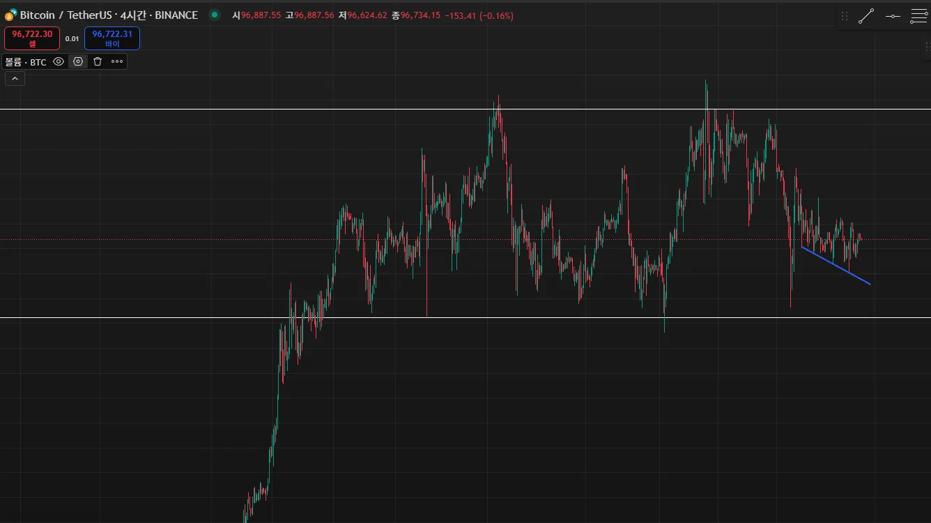 흰색으로 지지 저항선 작도 해보았고 고점도 저점도 계속 우하향하는 모습이 보입니다.
