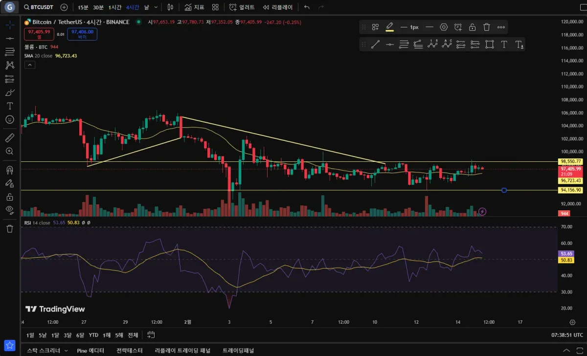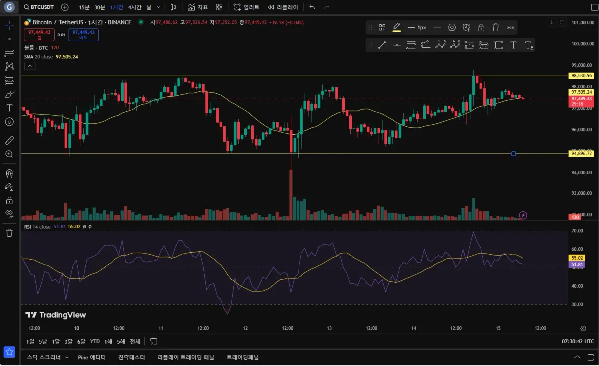 저는 2/15일 오후 4:30분 경 비트코인 차트로 작도를 했습니다.