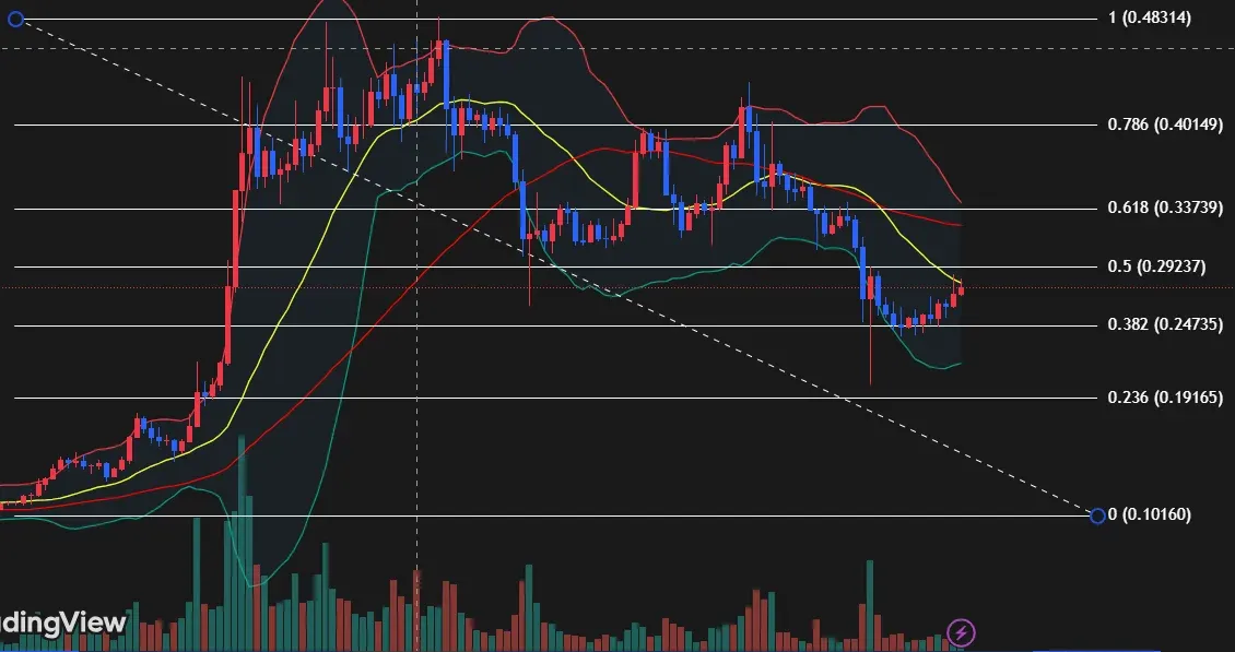피보나치 되돌림에서 0.382 저항인것 같고 볼린저밴드에서 하단 뚫은 뒤 상승세로 보여