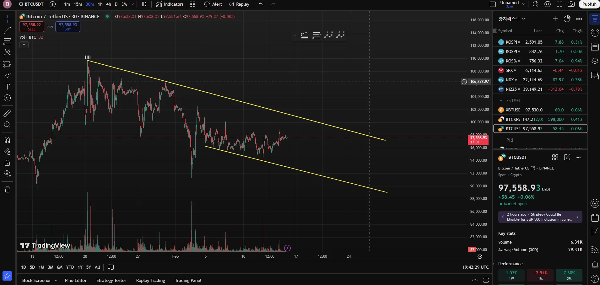 월봉으로 확인했을 때, 2~3년의 상승장 후 약 1~2년 의 하락장 패턴이 있는것을 발견하여 현재 비트코인이 분산국면, 즉 하락장에 돌입했다고 판단하여 하락장을 유추 할 수 있는 추세선을 30분 봉 차트에서 그렸더니 5터치 하락구간을 발견하여 추세선을 그렸습니다.