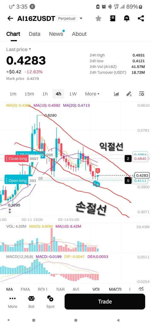 Ai코인은 4시간봉과 1w봉 1d봉들을 참고하여 추세선을 그리며 매매하였고 사진 첨부 하겠습니다