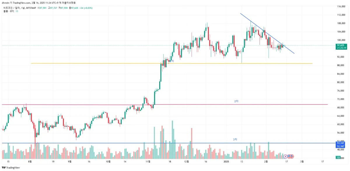 4시간 봉에서는 상승과 하락을 오고 가며 횡보 중입니다. 반등도 지지선 안에서 이동하고 있고 유의미한 변화 폭이 보이지 않습니다.