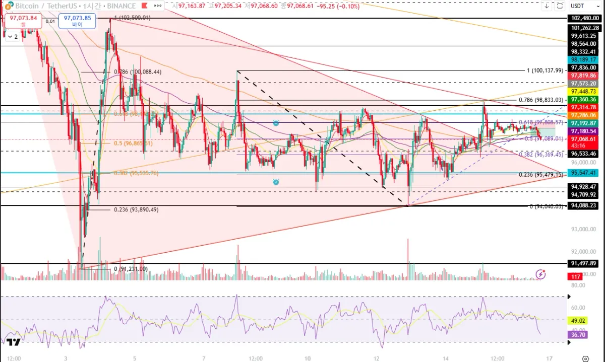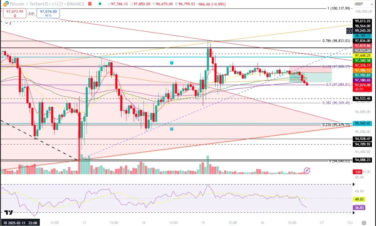 3) 1시간봉(파란색실선) 단기 추세선 깸