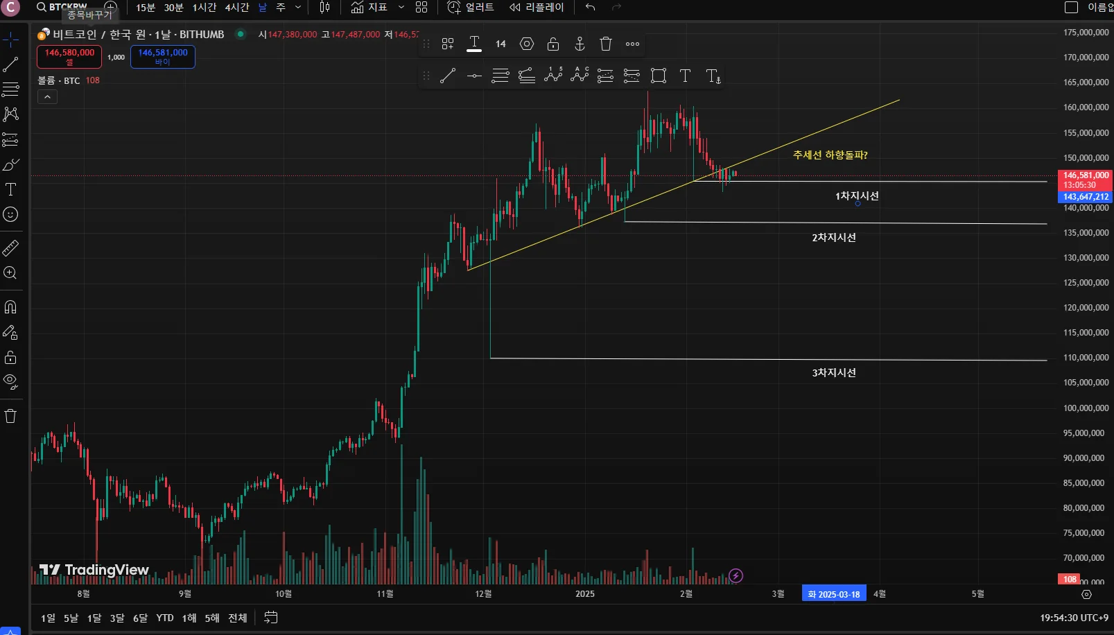 최근 3개월간의 비트코인 차트를 바탕으로 작도해봤습니다
