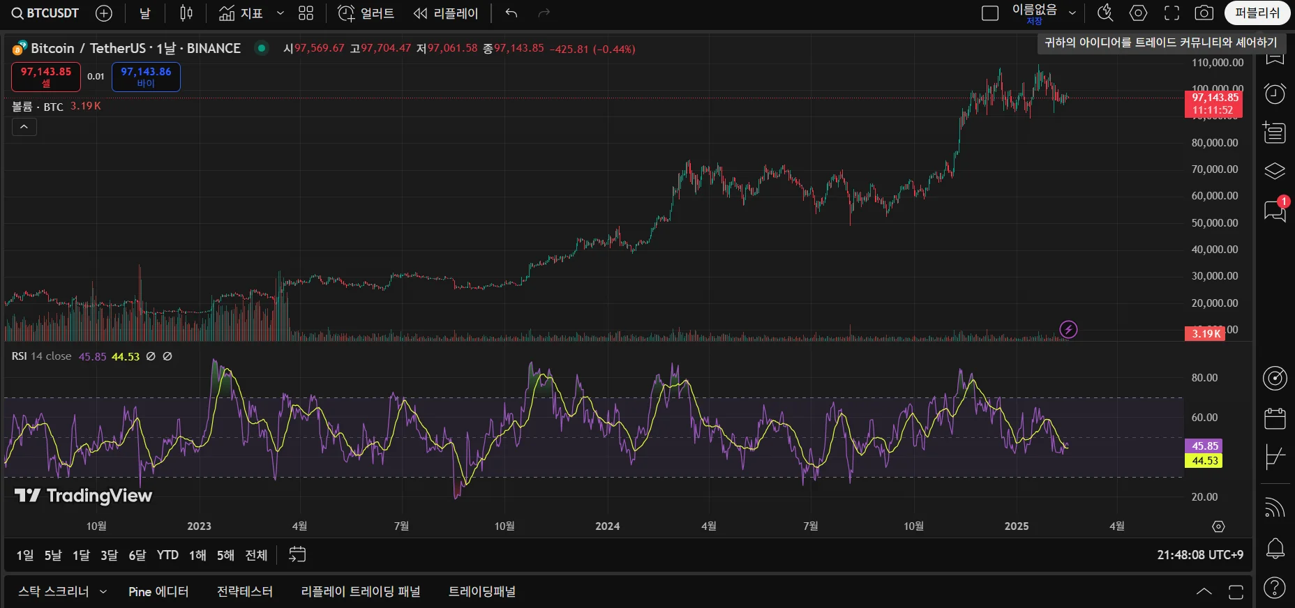 과매수 구간에서 급등을 확인할 수 있다.