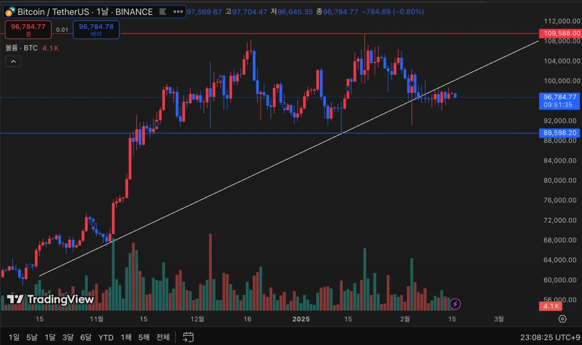 그려둔 추세선을 뚫고 하방으로 진입하였으나 현재 하락중. 하지만 거래량이 상당히 떨어졌기때문에 다시 상승할 여력이있다고 판단하여 추세선을 뚫고 올라갈때 진입 예정