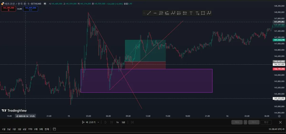 처음 급등한 캔들에서 오더블록 잡고 저항,지지를 많이 받았던 자리에 가로선 작도 및 추세선 작도