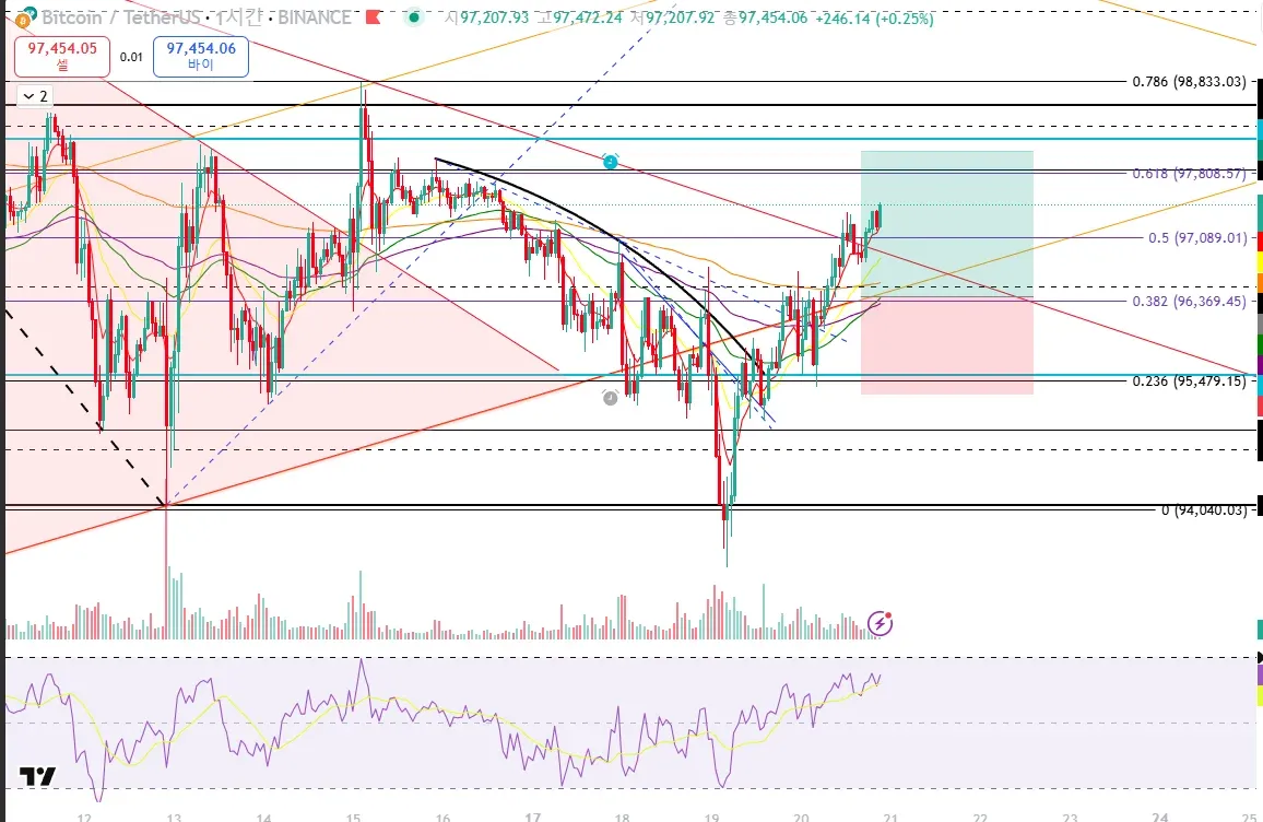우선 94K 구간에서 RSI 확인 후 피보나치로 0.236 지지해주고 반등하는 것을 확인 후 0.382 에 진입했습니다.