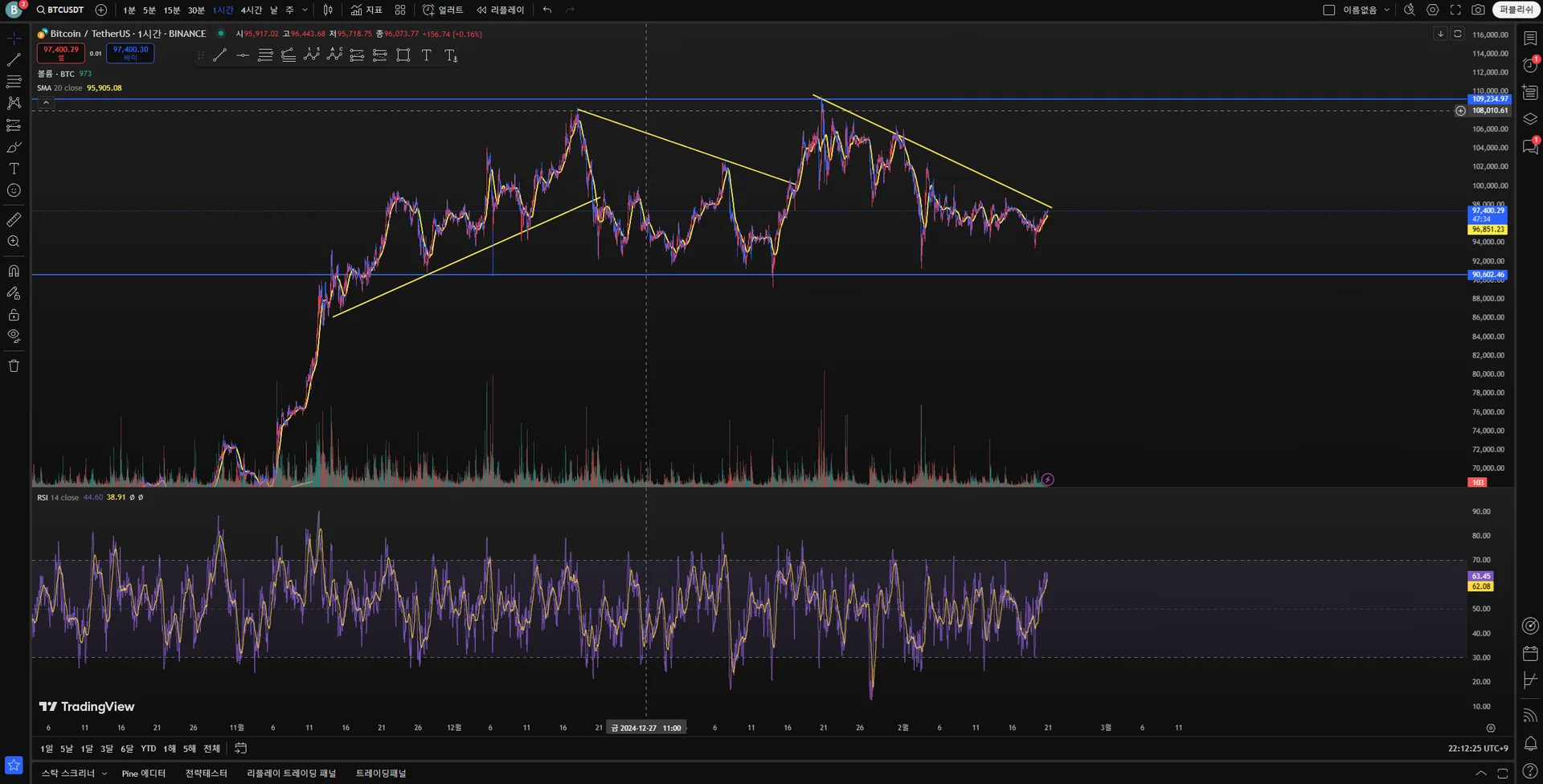 1시간 단위로 봤을때 2024-11-17 경 부터 박스권에 들어온것으로 보이며 박스권 안에서 상승과 하락이 반복되고 있는 것으로 보입니다.