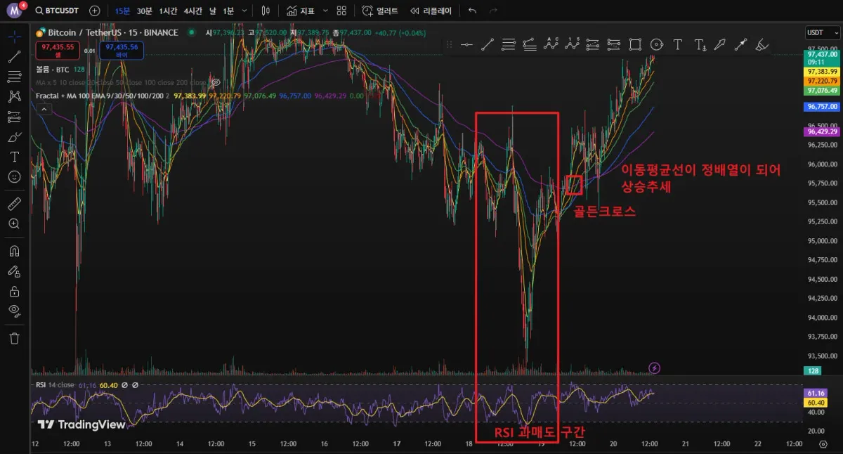 비트코인 15분봉으로 보니 18일~19일경에 상대강도지수(RSI)에서 과매도 국면을 파악할 수 있었고, 가격도 대폭 하락하였습니다.