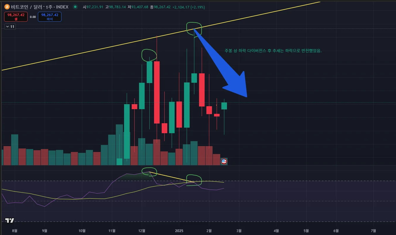 하락 다이버전스 예시? (제가 임의로 고가를 기준으로 했는데 종가 기준으로 해야 하는건지 궁금합니다.)