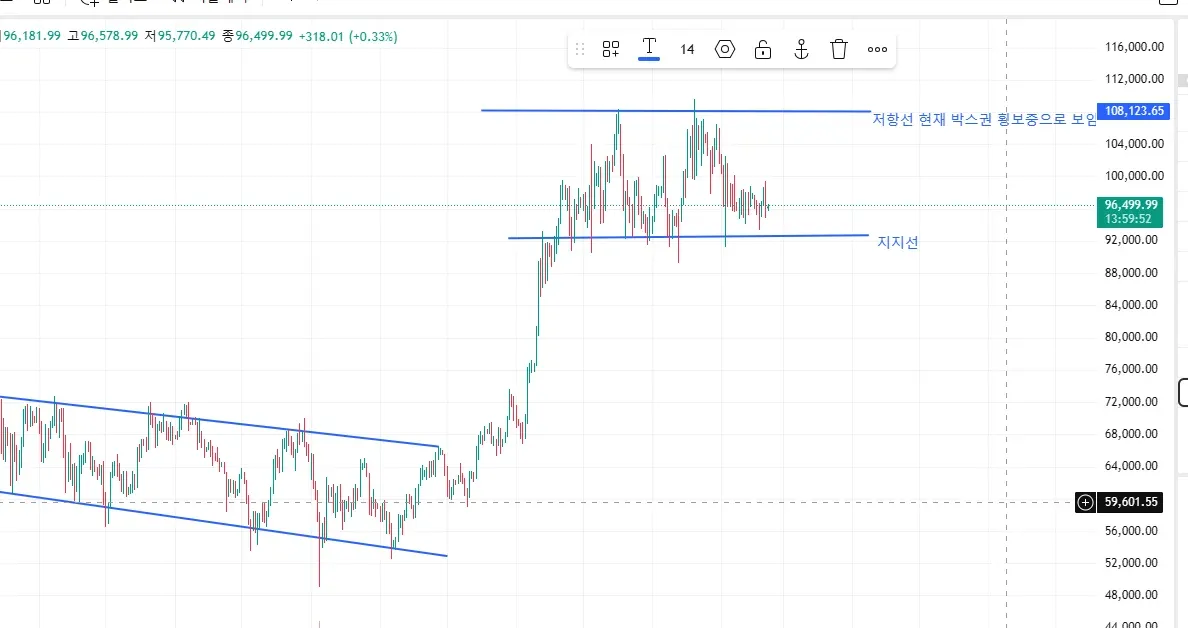 일봉으로 봤을 때 현재 박스권 횡보로 보여짐,,, 아직 상승할지 하락할지 방향성은 보이지 않음,,,, 하지만 알트 코인의 움직임과, 반감기의 주기로 봤을시에 불장 초입으로 판단하기 때문에 큰 맥락에선 결국엔 오를것으로 생각함. ,,때문에 현재 상태에서 매매는 관망하거나 단기 스윙을 노린다면 92층 언저리에서 살짝 매수를 하는 것도 나쁘지 않아 보임.