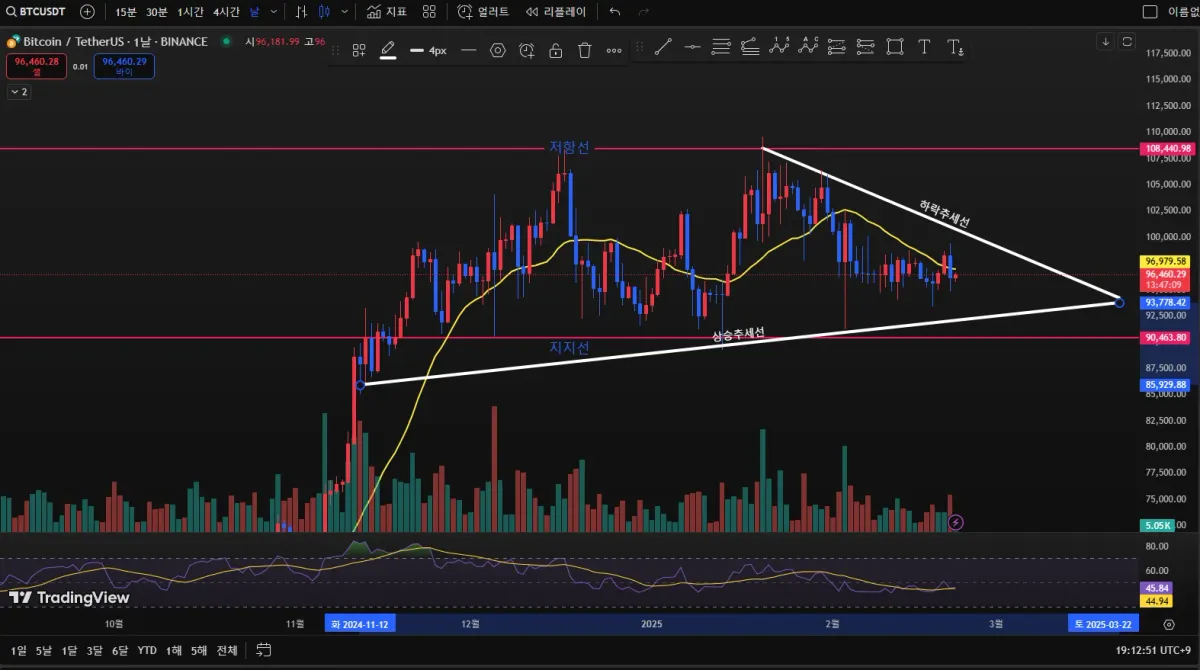 - 결론 적으로 지금은 하락추세의 삼각수렴 형태를 보이고 있다고 생각되며, 삼각형 꼭지점이 만나는 날은 3월22일 입니다. (이 부분이 의미 있는지는 모르겠습니다) 해당 날짜 전에 저 삼각수렴을 위로던 아래로던 뚫고 간다면 현재의 추세가 깨진다고 생각하여 그것에 맞는 대응을 해볼 수 있을 것 같습니다. 하락추세의 삼각수렴은 막바지에 가서 거래량을 동반하며 상방을 뚫어줄 때 큰 상승을 기대해볼 수 있다고 강의에서 본 것 같아서 그런 그림이 진짜 나오는지도 관찰해보겠습니다(상승론자의 뷰 입니다.) 한국시간 2025-2-22, 오후7시 기준