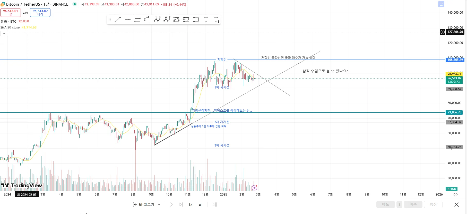 ㄴ3월부터 11월까지 저항선을 버텨주다가 11월 이후에 급등을 했으므로 3월 이후에 만약 73,806,70 까지 떨어지는게 포착 된다면 다시 올라갈 수 도 있지않을까해서 그어봤습니당 (근데 이게 리테스트의 정의가 맞나여,,??)